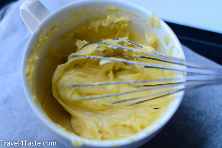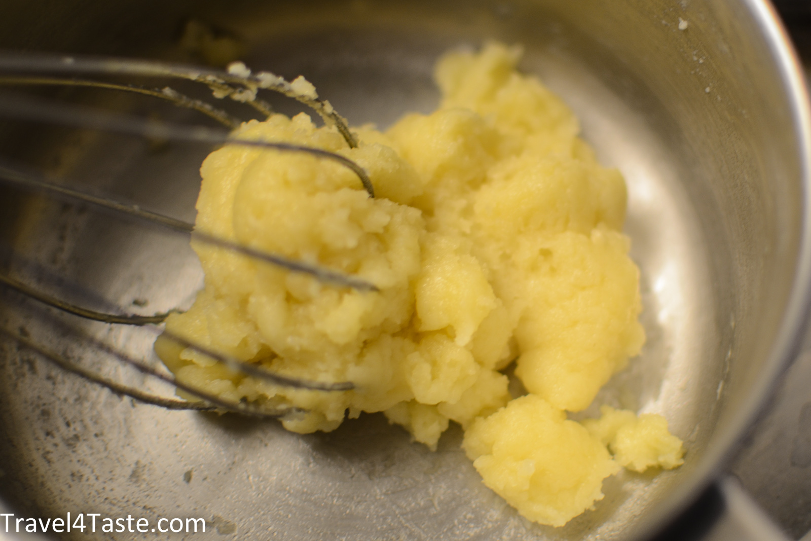 1. Pour water and milk in a saucepan and melt the butter in it on medium heat. Bring everything to the boil (stir it so the bottom doesn’t burn). It is not enough to just melt the butter. Instead it needs to be very hot, so that after adding the flour, the dough gets thick! Add the flour at once and stir everything until smooth on the hot stove.
