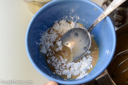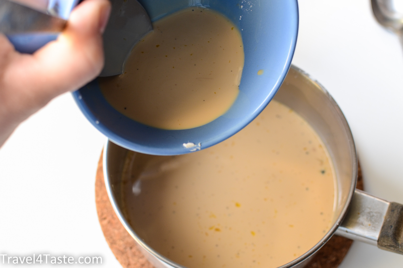 5. Mix the potato starch with 3 tablespoon of the milk mix and add it to the saucepan.