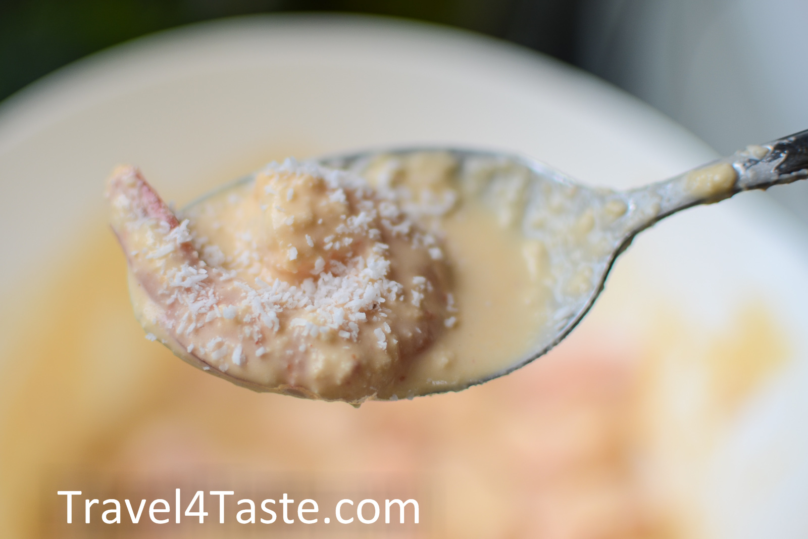 3. When done, add sliced mango (without skin) and apricots. Add steamed chili pepper without skin. Cook everything together for about 10min on a medium heat. Stir time to time. After this time all fruits should turn into “puree” and the sauce should be reduced a bit. Add the chili paste, Malibu and crushed garlic. Stir it all together. Put on the side and let it cool down.