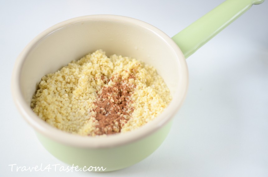 1. Cook the millet as indicated on the package. It is really simple. For one volume of dry millet add 2 volumes of water and cook on medium heat until all water absorbed (stir time to time). After the cooking mix them with the cinnamon.